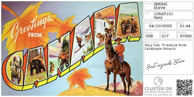 Confirmed contact with Steve 9EK945 Calabogie, Ontario, Canada.