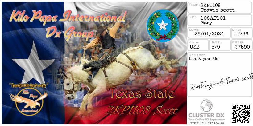 Confirmed contact with Travis - 2KPI108 Texas USA.