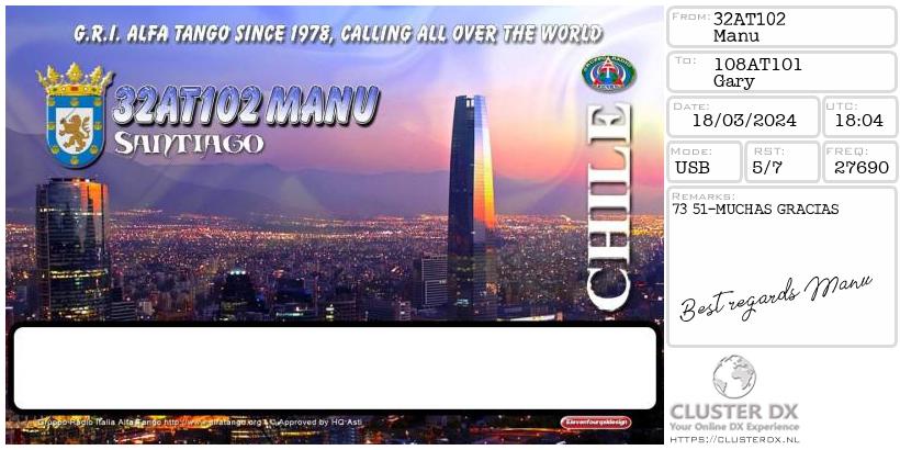 Confirmed contact with Manu 32AT102 Santiago Chile.