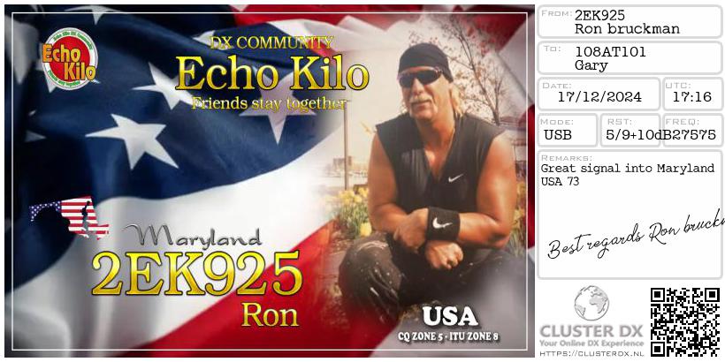 Confirmed contact with Ron 2EK295 Maryland USA.