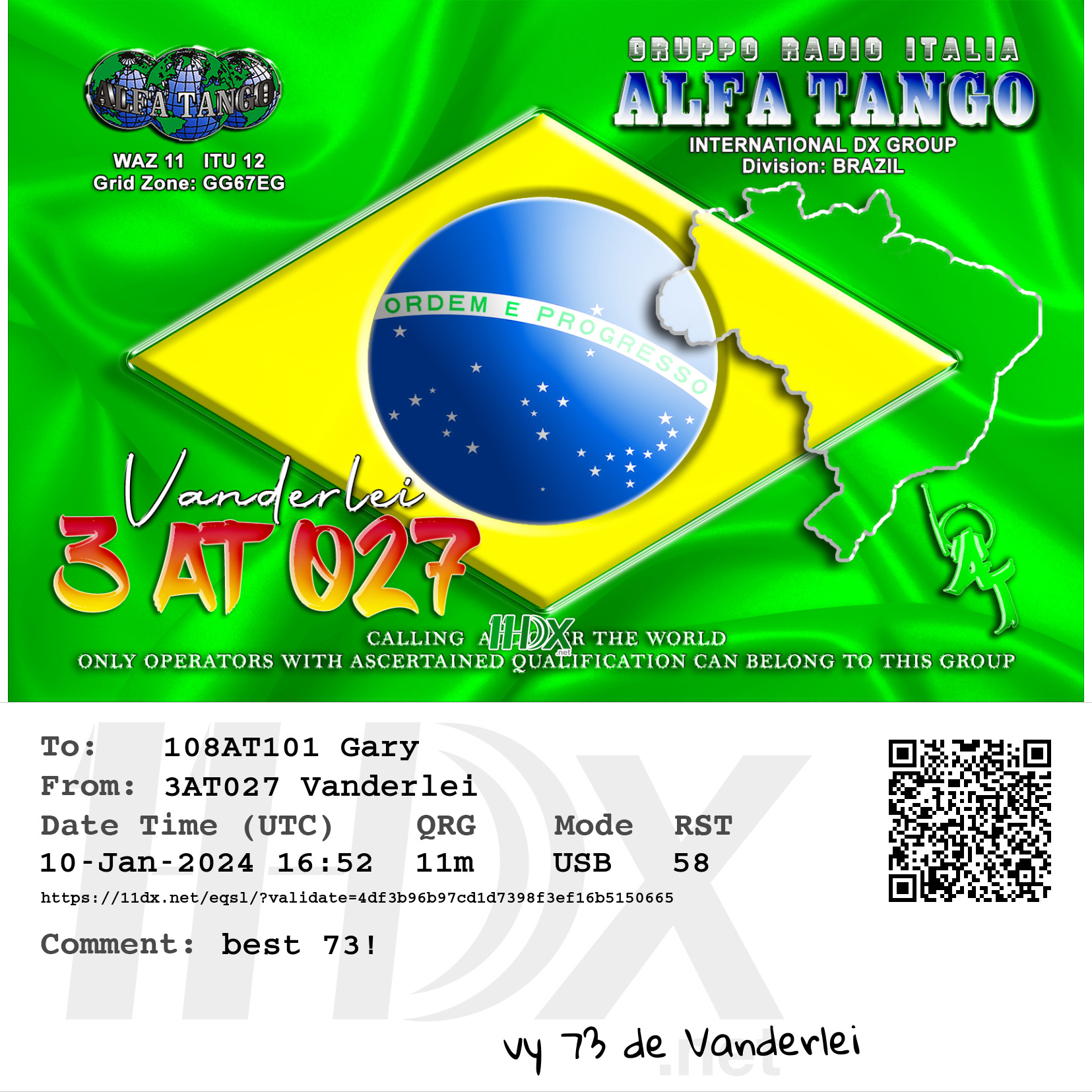 Confirmed contact with Vanderlei 3AT027 Brazil.