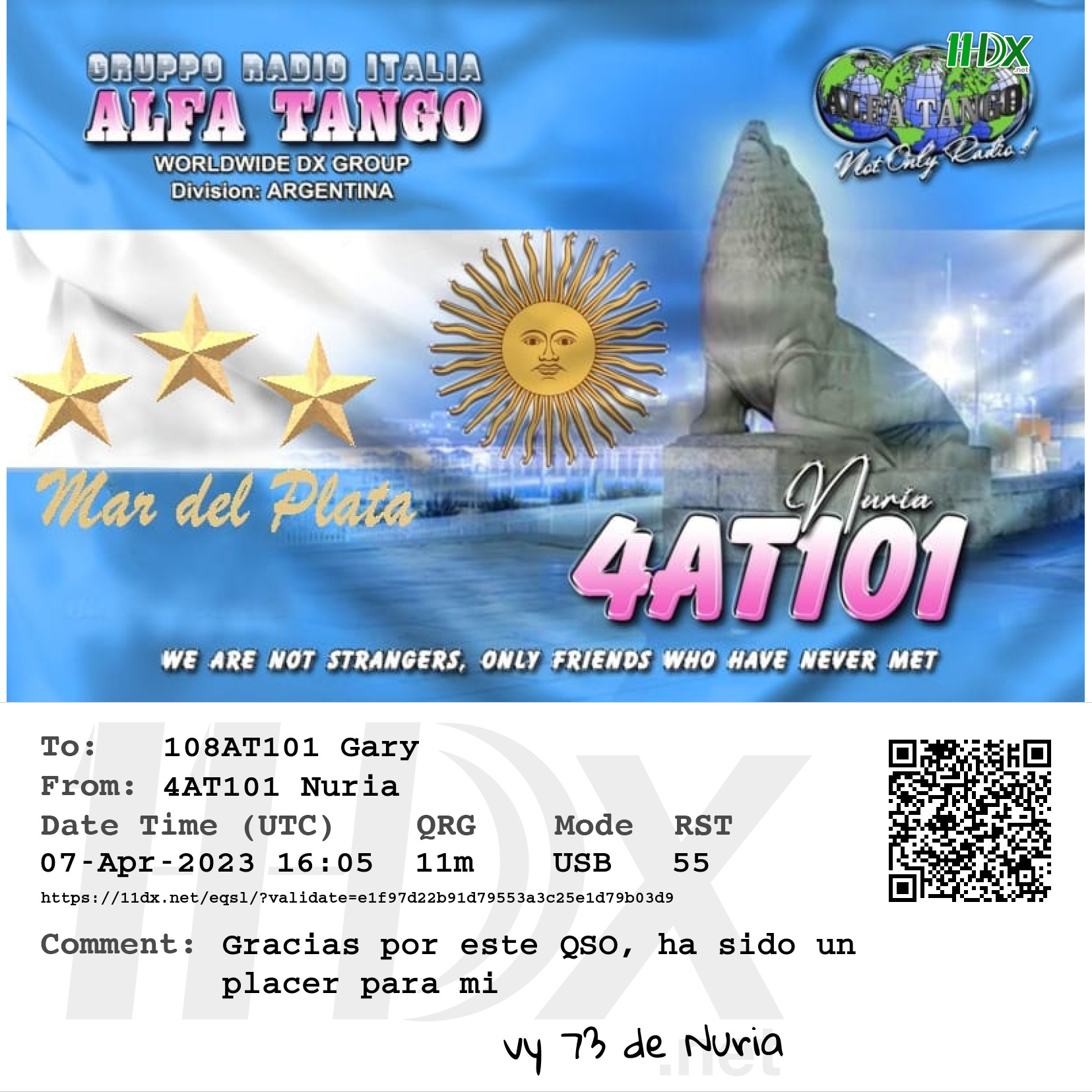 Confirmed contact with Nuria 4AT101 Buenos Aires, Argentina.
